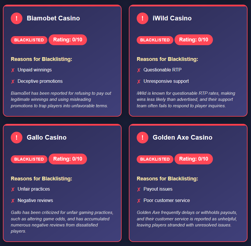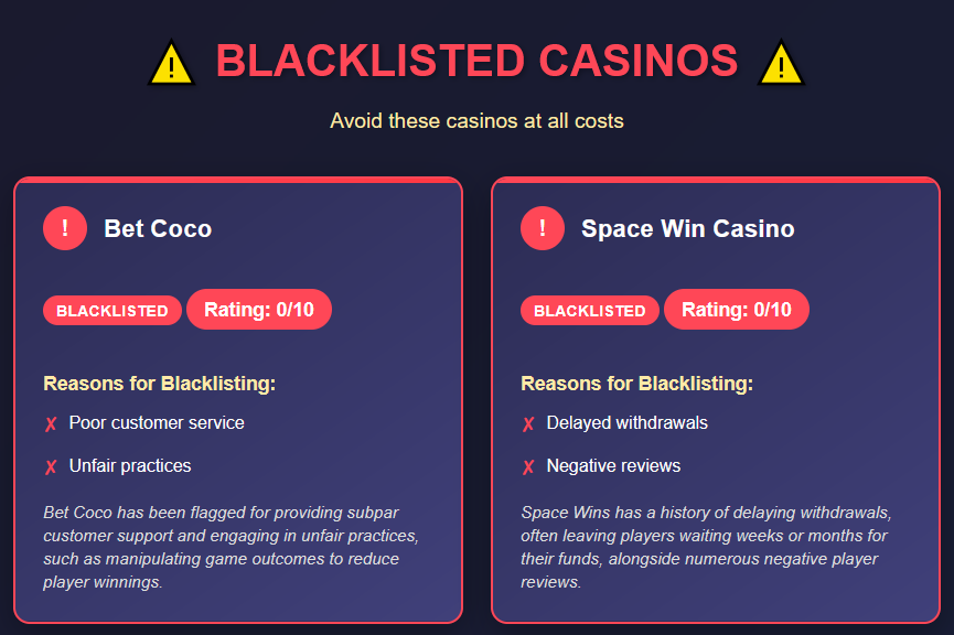 To illustrate the risks, here are detailed examples of casinos that have been blacklisted, along with the reasons for their inclusion. Each has been rated 0/10, signaling serious concerns for players: