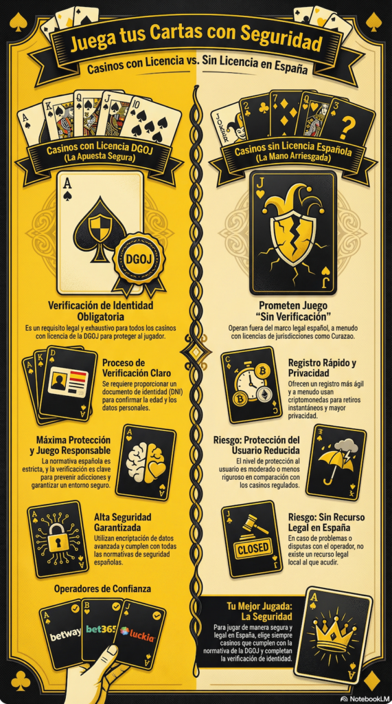 Si hablamos estrictamente de operadores con licencia DGOJ, la respuesta es no: todos están obligados por ley a verificar tu identidad para prevenir blanqueo de capitales y controlar el acceso de menores. Los anuncios que prometen jugar sin verificación se refieren a plataformas con licencia extranjera (Curaçao, Anjouan) que no están supervisadas por la DGOJ.